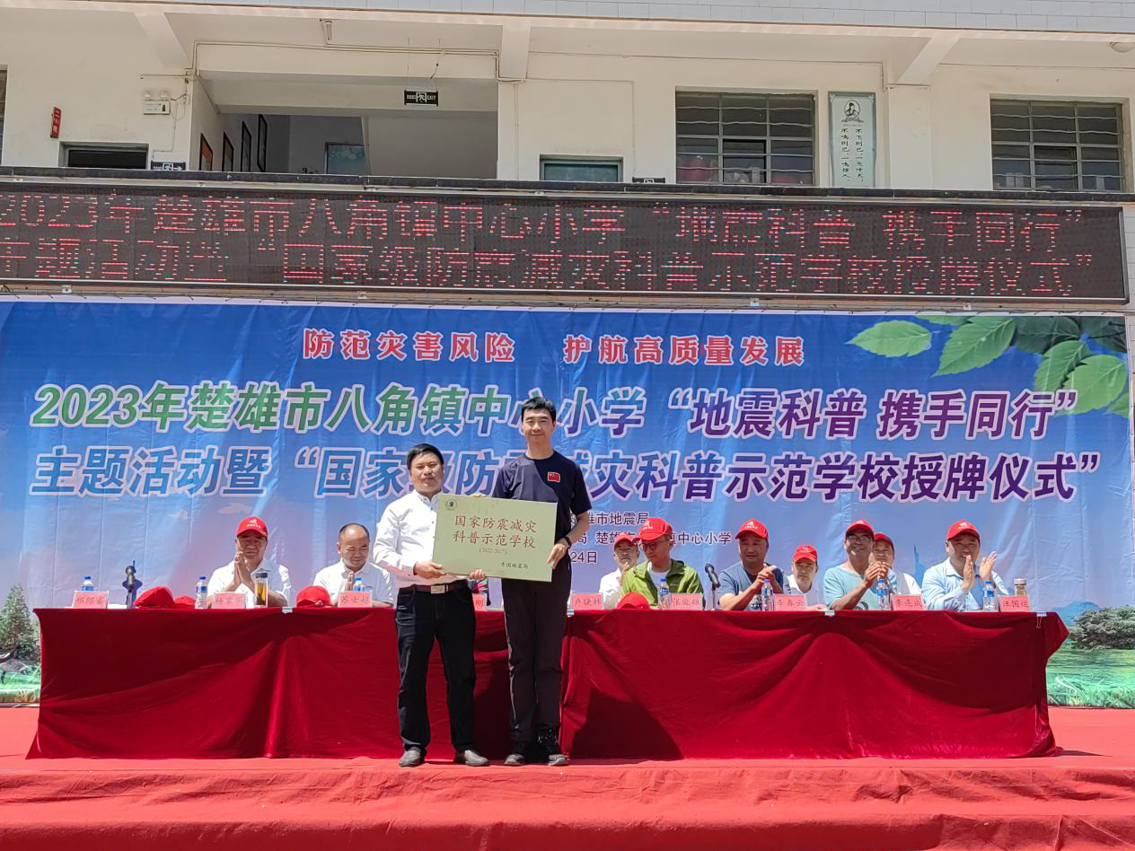 州地震局局长卢晓林为八角镇中心小学颁发“国家级防震减灾科普示范学校”荣誉校牌,这是对八角镇中心小学防震减灾科普宣传工作的肯定和激励。