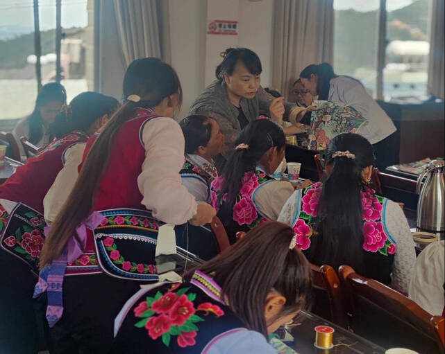 本次培训以“强基础、拓眼界、增学养”引导妇女增强文化自信,提升妇女手工技能为目的,采取理论指导和实际操作相结合的方式进行,以接到的手工艺品订单为主开展。大姚县咪依噜民族服饰制品有限公司董事长罗珺以自身经历为大家传授经验,让绣娘们明白彝绣产品有很大的使用价值、艺术观赏价值、经济价值,希望大家能传承此项“指尖艺术”,知道一颗小小绣花针带来的巨大能量。大姚县咪依噜民族服饰制品有限公司刺绣培训讲师白丽从彝族文化、彝族服饰、彝族纹样、色彩搭配、刺绣针法、缝纫技术、订单意识等多个方面进行集中上课讲授和现场指导培训。