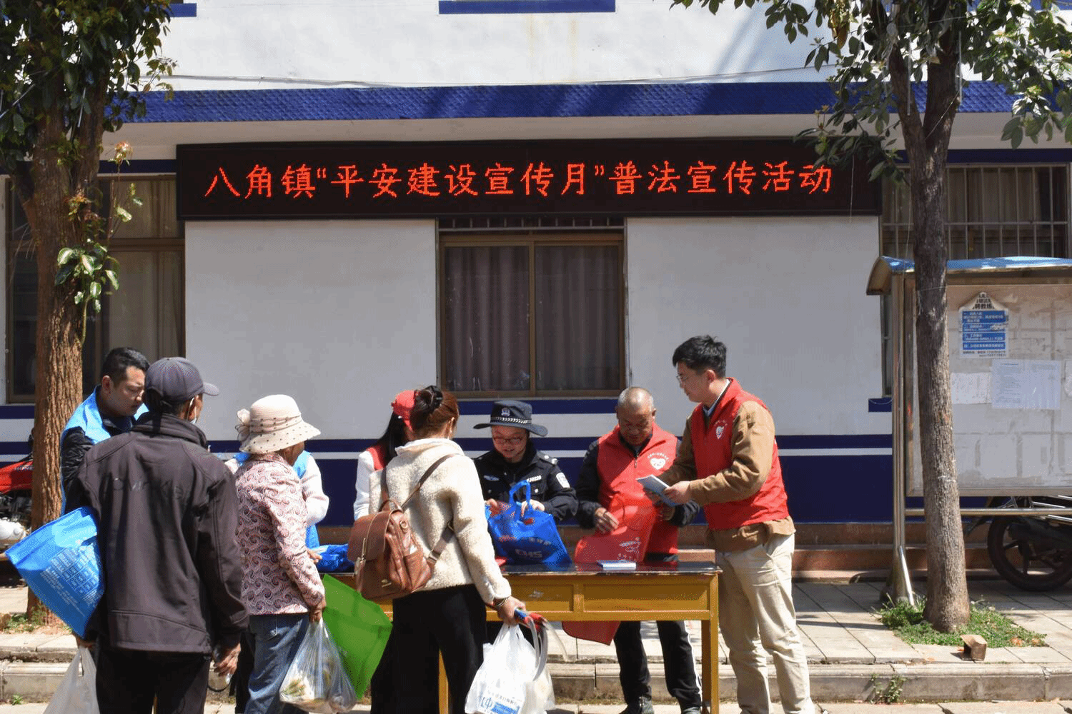 为深入推进平安八角建设,切实增强基层群众的法治观念和安全防范意识,打通法治宣传“最后一公里”,近日,八角镇充分利用“街天”赶集日人流密集、群众集中的有利时机,组织平安法治办、司法所、派出所、党群服务中心等多部门联合开展综治宣传月普法宣传活动,将法治知识、平安理念送到群众身边,让平安宣传从“文件”走向“街头”、从“会场”走进“集市”。