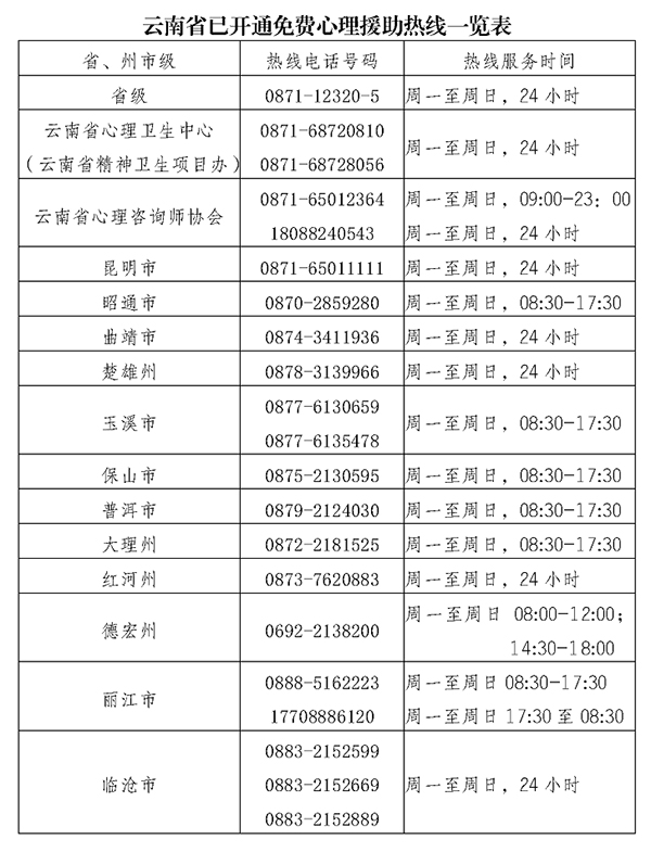按照省应对新冠肺炎疫情工作领导小组指挥部办公室《关于设立应对疫情心理援助热线的通知》要求,省级及部分州(市)已开通应对疫情免费心理援助热线,向公众提供心理支持、心理疏导等服务,指导大家面对疫情能做好心理防护、缓解负面情绪,预防与减轻疫情所致的心理困顿。若有需要,可拨打以下电话: