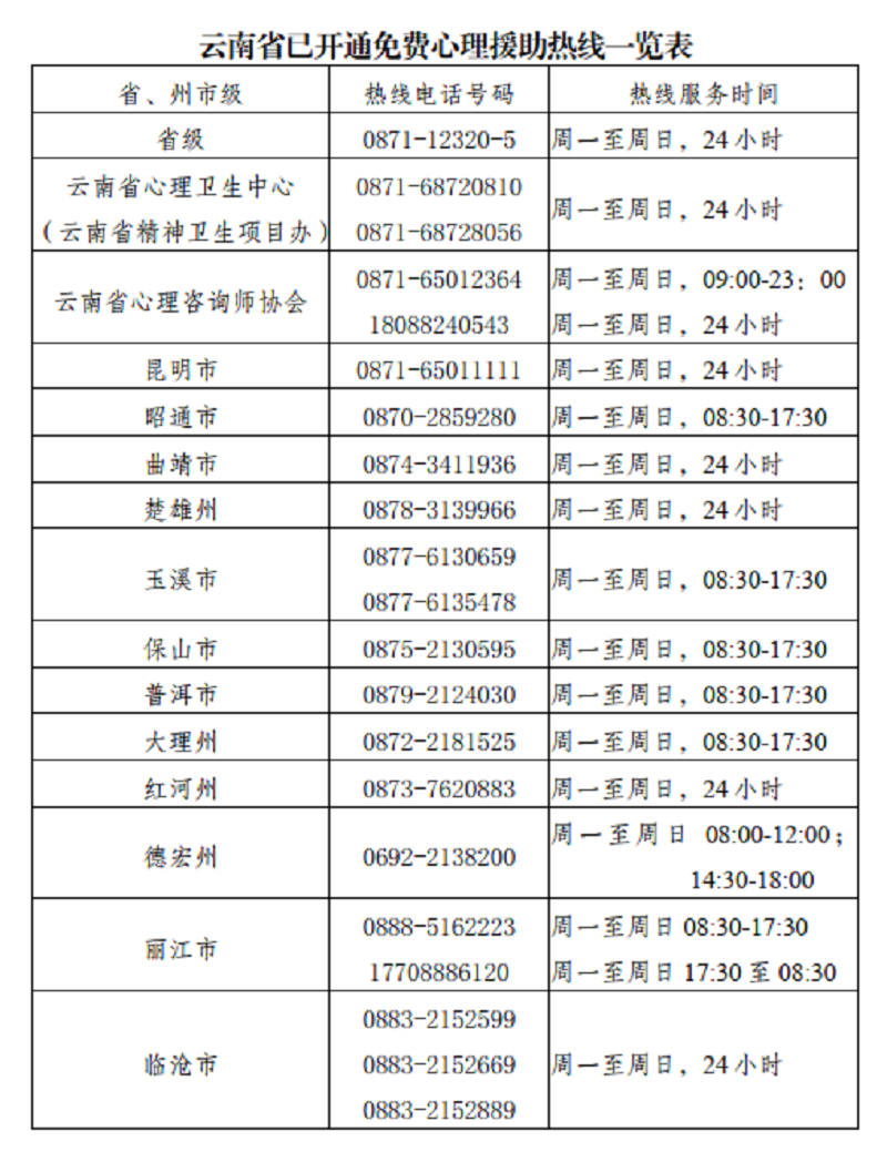 按照省应对新冠肺炎疫情工作领导小组指挥部办公室《关于设立应对疫情心理援助热线的通知》要求,省级及部分州(市)已开通应对疫情免费心理援助热线,向公众提供心理支持、心理疏导等服务,指导大家面对疫情能做好心理防护、缓解负面情绪,预防与减轻疫情所致的心理困顿。若有需要,可拨打以下电话: