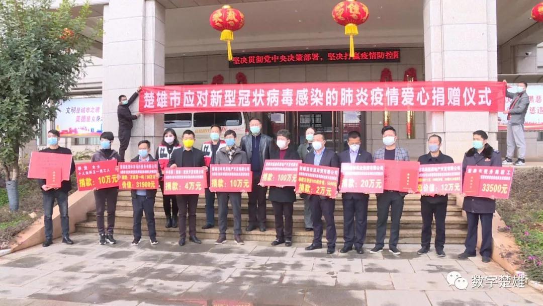 据了解,在当天上午的捐赠仪式上,共接收了来自楚雄市盛鑫祥房地产开发有限公司100万元、楚雄格林实业集团有限公司20万元、楚雄市丰邦房地产开发有限公司10万元等五家企业、一家单位、一家宗教团体共计152.35万的捐款和楚雄康湶体育场所服务有限公司捐赠的一吨(50万片)消毒药品、楚雄尚越房地产开发有限公司、楚雄亚西亚商贸有限公司等企业捐赠的口罩、防护服、方便面等共计18.94万元的各类防控物资。