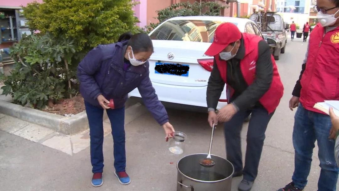 由于当前疫情防控形势严峻,不宜组织大量人员聚集,在栗子园社区,楚雄齐苏堂彝医馆的工作人员把大锅药熬制好后,由社区工作人员及志愿者们将药送至每栋单元楼前,供居民领取。