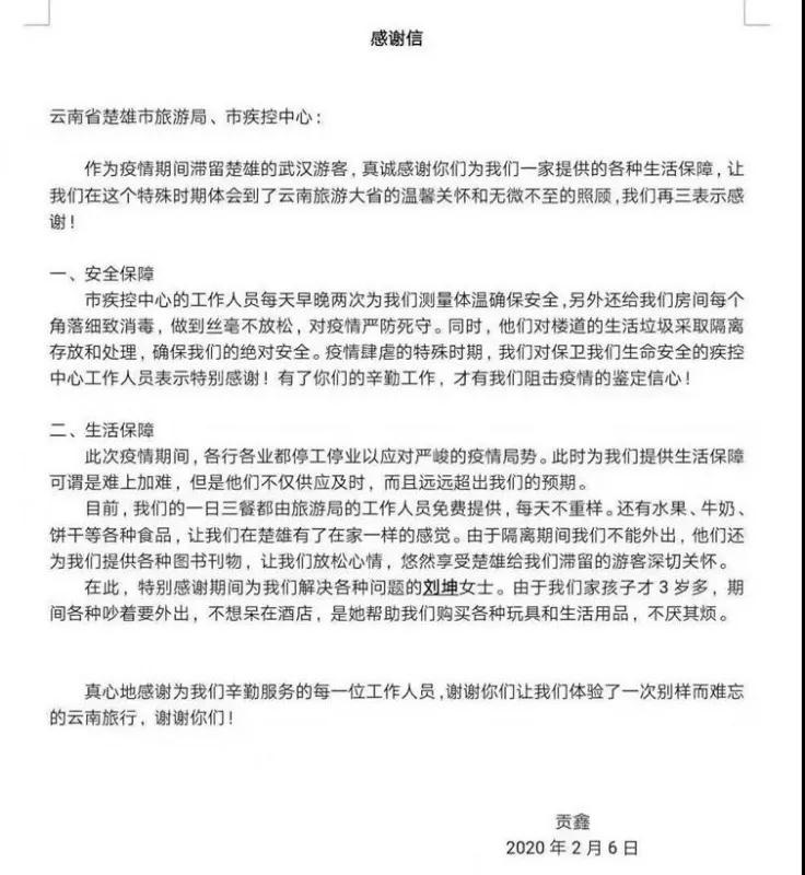 “作为疫情期间滞留楚雄的武汉游客,真诚感谢你们为我们一家提供的各种生活保障,让我们在这个特殊时期体会到了云南旅游大省的温馨关怀和无微不至的照顾,我们再三表示感谢!”2月6日上午,楚雄市文化和旅游局收到一封来自滞留楚雄市的湖北籍游客贡先生代表他们一家3口和全体滞留楚雄市集中安置游客书写的感谢信。