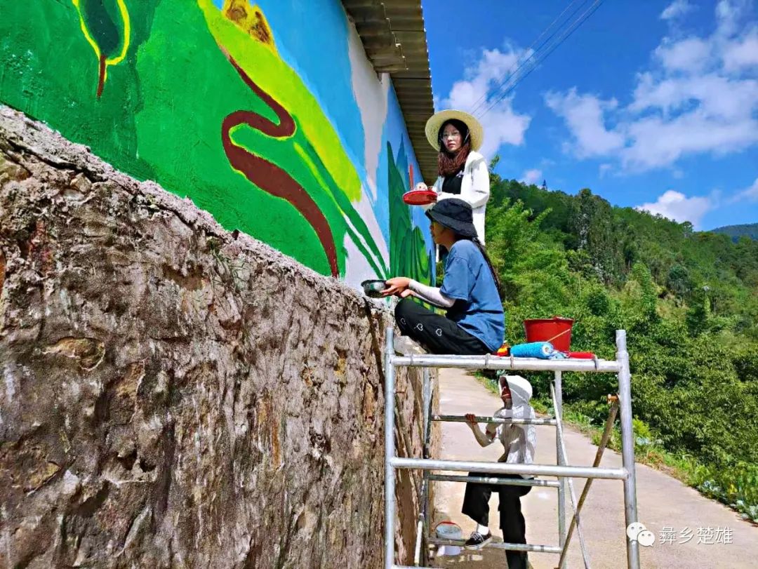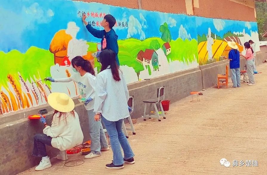 当天中午,乘车2.5个小时后,还未来得及在三街集镇上稍作歇息,师生们便匆匆到达了此行的首站多衣树村。从大城市来到多衣树村,一切立马都变了,这里没有了喧嚣的声音、没有了密集的街道,目之所及,能看到的就是镶嵌在青山绿水间的一个个自然村落、一间间古朴无华的老式瓦房,充满了宁静安逸的气息,让人顿生诗情画意,一行人皆被这里清新多彩的景致所吸引。大家心潮澎湃,二话不说,即刻就投入到了工作中。他们中有的去看村子里彩绘墙面的打理情况、有的忙着设计墙绘的图纸、有的准备搭墙绘的脚手架,还有几个帮着刷竹围栏的油漆。就这样,大家一刻不停 行动了起来。才来到乡下第一天,师生们就在村里干活直到夜晚11点多才回到驻地安歇。之后的十天里,服务队一直是早出晚归,最晚的一天干到凌晨一点多。服务队在三街镇的多衣树村委会、上新房村委会、土墙村委会、蚂蝗箐村委会的村寨和学校里辗转工作着,引来了无数村民们赞许的目光,安静的村庄也随着这群大学生的到来而变得热闹起来。服务队里,有8名同学是大学二年级的女生,她们身材纤弱、肌肤稚嫩,看着就吃不下墙绘这种爬高上低、头顶烈日的苦差事。七月骄阳似火,正是一年中酷暑难耐的时候,在服务队为墙绘建设工作的十天时间里,几乎天天是烈日当顶,当她们完成了一幅幅美丽的墙画后,你不得不佩服这群女孩的顽强毅力和吃苦精神。巾帼不让须眉,从这群女孩身上,我们找到了乡村振兴的动力,看到了乡村振兴的希望,感受到了乡村振兴的美好。