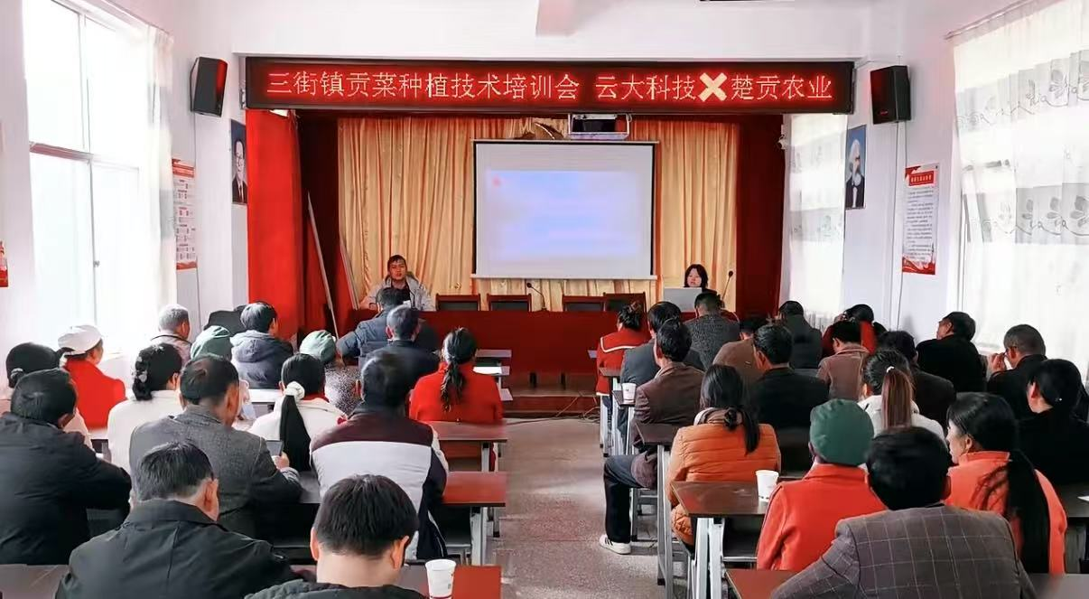 蝶变:政府搭台,科技唱戏。在政府主导下,楚贡农业与云大科技深度合作,开展“理论+实践”双轨培训,累计举办技术讲堂16场,实现11个行政村全覆盖。专家团队既在课堂上系统讲授科学种植理论,更深入田间示范高产栽培、绿色防控等关键技术,普及农产品质量安全标准体系,推动现代农业理念落地生根。通过“讲给农民听、做给农民看、带着农民干”的培训方式,累计培育出60余名本土技术骨干,逐步形成“一人带一户、十户带全村”的示范带动效应。政企农携手,蹚出了一条“科技种好菜,好菜卖好价”的致富路径。