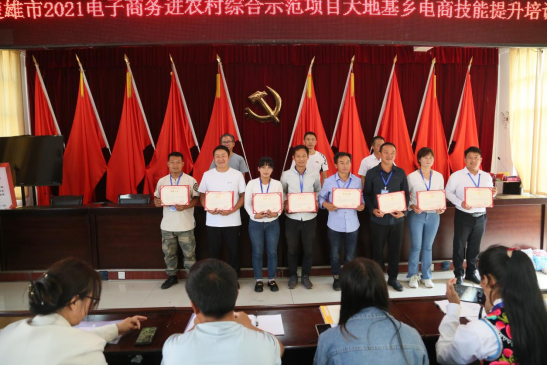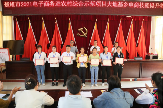 9月22日下午,由大地基乡党委委员谢洪斌和楚雄市电子商务公共服务中心负责人王琦为本次培训班的优秀学员和优秀小组颁发荣誉证书。本次楚雄市2021电子商务进农村综合示范项目大地基乡电商技能提升培训圆满结束!