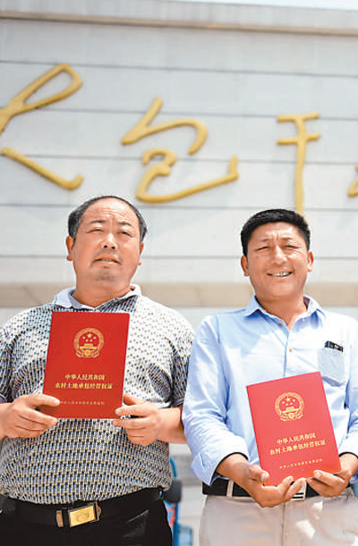 安徽省凤阳县小岗村农民展示领到的《农村土地承包经营权证》。