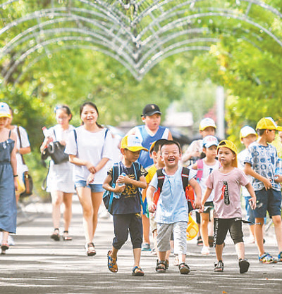 游客在浙江省宁波市奉化区滕头村生态旅游景区游览。