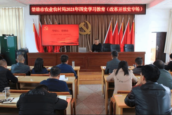 为深入学习改革开放以来取得的成绩,7月27日下午,楚雄市农业农村局全体干部职工在单位会议室开展了以“守初心 担使命”为主题的四史学习教育改革开放史专题学习讲座,局办公室主任李作伟为全局干部作了专题讲授。