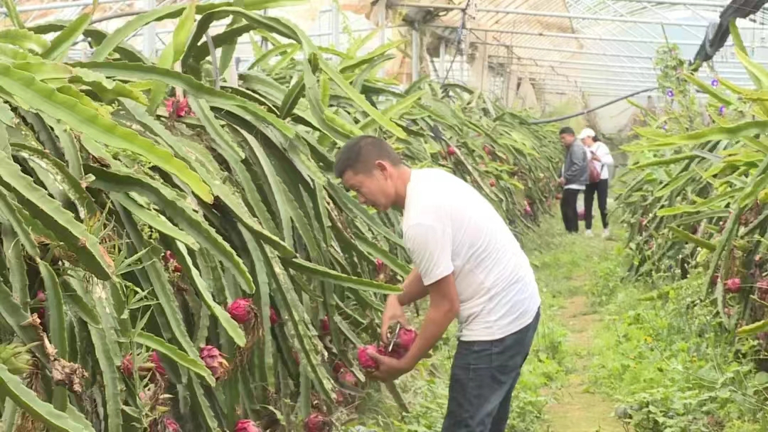 在广袤的田地上,农民们也迎来丰收采摘的季节。东瓜镇庄甸社区蔡家冲小组水果种植户蔡学义今年种植了50多亩水果,有火龙果、葡萄和草莓,现火龙果已进入成熟期。基地上的火龙果树排列整齐,一枚枚色泽鲜艳、果形饱满的火龙果垂挂在仙人掌状的蔓条上,看似小灯笼低垂,一派丰收喜人景象。