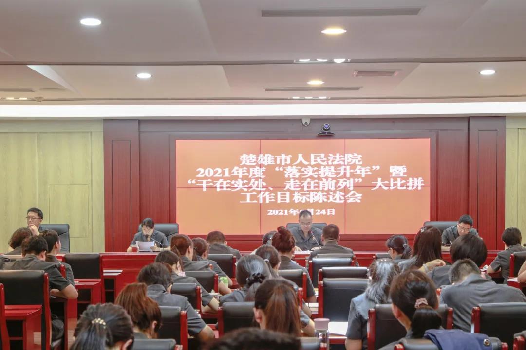 5月24日上午,楚雄市人民法院召开2021年度落实提升年暨干在实处走在前列大比拼陈述会,内设机构负责人向全院干警陈述年度工作目标和具体措施。