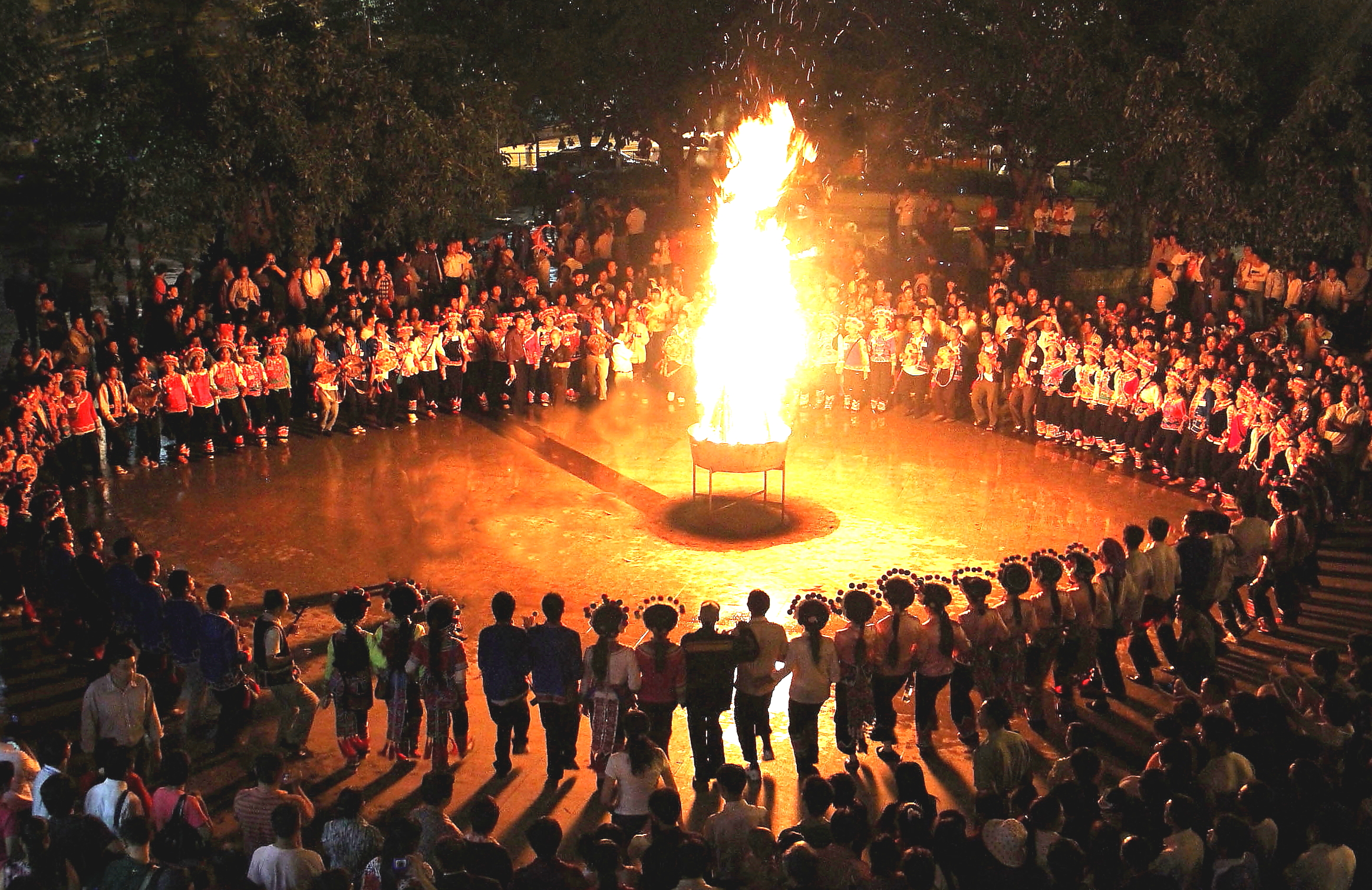 彝族火把节在每年农历六月二十四日至二十七日,火把节期间,彝族村寨举行隆重的祭祀活动,祭天地、祭火、祭祖先、驱邪除恶,祈求六畜兴旺、五谷丰登、家宅平安,体现了彝族人民尊重自然规律、追求幸福生活的美好愿望。节日期间,举行盛大的对歌、跳脚、摔跤、磨担秋等文艺体育活动,内容十分丰富。火把节是彝族原始宗教传承的舞台,彝族歌舞、服饰、饮食展示的平台,其内涵积淀深厚,外延宽泛,包容了彝族的饮食文化、服饰文化、歌舞文化、农耕文化、星象文化、祭祀文化等,这些文化的潜在价值正逐步展现出来,是研究人类社会发展史的活化石;节日期间,彝族探亲访友、邻里相聚,促进了人与人之间的沟通,化解了在生产生活中产生的矛盾,促进彝族村寨进一步向和谐社会转化;火把节不但是彝族文化的象征,同时也是中华火文化的重要组成部分,火把节与彝族的十月太阳历关系密切,其节期是通过所观测到的星象变化来确定的,有着重要的科学价值和文化价值;火把节还是扩大对外开放,发展地方经济的重要舞台,以政府主导、群众参与形式的火把节,扩大了对外影响,促进了招商引资,发展了地方经济,因此,对火把节实施保护具有重要的意义。2006年5月,彝族火把节被国务院公布为“中国非物质文化遗产代表作名录”。