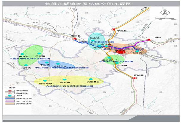 一、优化城镇空间布局。围绕特色宜居城市建设,做优城市、做特集镇、做美乡村,着力构建“一心、三带、六组团”的城镇空间架构,形成布局合理、功能互补、山坝结合、城乡一体、特色鲜明的城镇化发展新格局。一心即以楚雄市城市建成区为中心,包括鹿城、东瓜、苍岭和紫溪镇。三带即以楚南一级公路为主,包括楚雄市鹿城、东瓜、苍岭、吕合、紫溪镇,连接南华县城的楚南经济带;以楚广高速公路为主,包括楚雄市鹿城、东瓜、苍岭镇,连接禄丰县广通镇的楚广经济带;以元双公路为主,包括鹿城、东瓜、吕合、东华、子午镇,连接牟定和双柏县城的元双经济带。六组团以开发区、鹿城镇、东瓜镇、苍岭镇为重点,统筹推进产业布局、商住、交通、市政和公共服务设施建设,打造鹿城东瓜苍岭城市发展组团;以元双经济带为依托,加快发展优质粮、优质烟、优质水果和商品蔬菜等种植基地,打造东华子午现代农业组团;以青山嘴、九龙甸、西静河水库库区周边和紫溪山生态环境保护为主,强化生态修复与水源保护,提升生态涵养功能,打造紫溪吕合生态涵养组团;发挥新村、大地基、西舍路的区位、生态、气候等优势,开发马龙河、礼社江、哀牢山特色资源,发展生态、乡村、科考、探险等旅游,打造大地基新村西舍路生态旅游组团;依托中山、大过口等中心集镇建设,加快发展集镇经济和彝族文化旅游,完善生产资料、特色农产品、物联网、文化旅游等基础设施,打造中山大过口商贸物流及文化旅游组团;统筹整合优势资源,发挥产业聚集效应,推进三街、八角、树苴等乡镇特色产业发展规模化、高端化、绿色化,打造三街、八角、树苴特色有机农业组团。