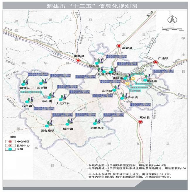 四、拓展通信网络覆盖。以信息网络基础设施和数据平台共享建设为重点,规划建设信息基础和信息化应用项目,构建资源配置的信息枢纽,全面提升信息化水平。支持广电、电信等企业强强合作,推进电信网、广电网、互联网“三网”融合,实现通信骨干网络光纤、宽带、下一代互联网、广播电视网、4G网络、WiFi网络等无缝接入,逐步建成以光纤传输、微波传输、卫星传输相互配套的宽带高速信息传输主干网,提高网络传输能力和覆盖率。实施“互联网+”工程,促进大数据、云计算、物联网、移动互联网等与天然药业、绿色食品业、商贸物流业结合,推动电子商务、互联网金融、文化创意融合发展。重点规划建设楚雄信息产业园区(包括科技产业园、电子商务城、中小企业创业园和青年大学生创业园),加快建设产业公共技术服务、企业技术研发、科技成果转化、科技金融服务等创新平台,建立和完善政务信息、地理信息、企业基础信息、电子商务和民生信息等公共服务平台,努力建设“智慧楚雄”、数字楚雄。加强电子政务网络建设、维护和升级,提高政府公共服务和管理效能。支持城镇邮政基础设施建设,发展以机械化、自动化和计算机网络化技术为标志的现代化邮政。建立健全邮政电信普遍服务保障机制,积极推进信息资源共享及服务。加大城市通信弱电管道网规划建设力度,避免无序敷设。加强网络监管、确保信息安全,构建宽带、融合、安全的信息基础设施体系。到2020年,初步形成安全、便捷的互联网配套体系,实现全市乡镇邮政多点服务、电信普遍服务100%覆盖,宽带网络在广大农村得到普及,建制村覆盖率达100%,电话普及率达85部/百人左右,互联网普及率达80%左右。