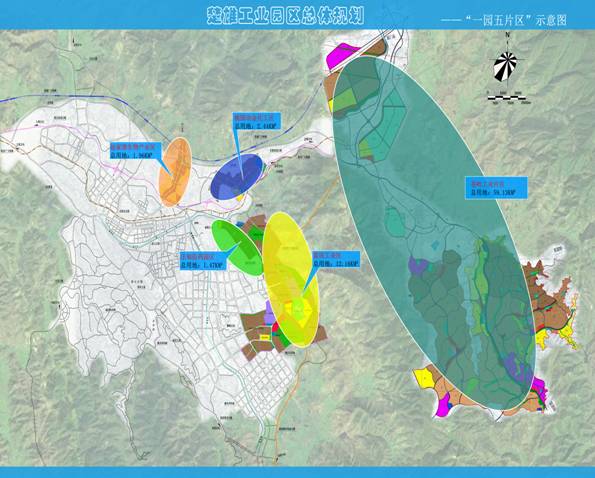 楚雄工业园“一园五片区”规划 楚雄工业园区包括富民、庄甸、桃园、赵家湾、苍岭5个片区,总规划面积70.93平方公里。富民工业片区位于鹿城镇富民社区,规划建设面积12.16平方公里,重点发展烟草及配套、装备制造、新型建材及商贸物流等产业,目前已入园企业58户;庄甸医药片区位于东瓜镇庄甸社区,规划建设面积1.47平方公里,重点发展生物医药业,目前已入园企业21户;赵家湾生物产业片区位于东瓜镇詹家社区,规划建设面积0.96平方公里,重点发展绿色食品加工业,目前已入园企业21户;桃园冶金化工片区位于东瓜镇桃园社区,规划建设面积2.44平方公里,重点发展冶金化工和新型建材业,目前已入园企业22户;苍岭工业片区位于苍岭镇,规划建设面积53.9平方公里,其中云甸片区39.82平方公里,苍岭片区14.08平方公里,重点发展新型建材、装备制造、生物医药和商贸物流等产业,目前正在进行基础设施建设。 |