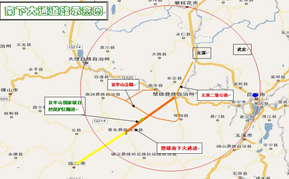 楚景公路(楚雄南下大通道):楚景公路即楚雄至景东二级公路。走向为:楚雄市--东华(元双公路出口)--白依河--此务丫口--石桂山--新村--密者河电站--西舍路(与水弥线交叉)--董家坝(国家级自然保护区隧道)--徐家坝(中科院动植物研究院)--太忠--景东,公路全长约200公里。建设理由:1.景东县是楚雄南部出境最近的一座城市,打通楚景公路,可连接楚雄、景东两地的断头路,搭建楚雄与普洱两市的交流平台。2.楚景公路是连接楚雄与普洱两地的优选捷径,直线距离90公里左右,按二级公路标准设计,全长约200公里,可缩短普洱、临沧等南部地区与楚雄的距离,缓解昆明大交通压力。3.楚景公路建设可为“哀牢山国家公园”建设开发和礼社江流域的水资源开发提供便捷的交通条件。昆楚城际列车开通后,从昆明出发,可在3到4小时进入哀牢山核心区,实现建设“大交通、大生态、大旅游”目标。4.建设楚景公路是两地人民多年的夙愿,具有良好群众基础。