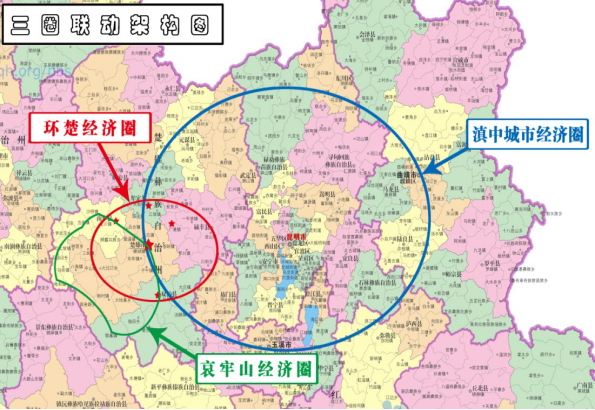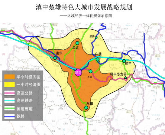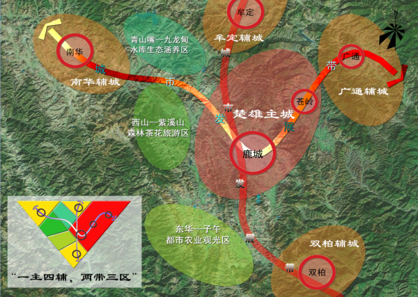 (8)发展布局。根据国家和省州主体功能区规划对楚雄市国土空间的战略定位和区域发展现状,以及未来发展的需要与资源、环境相匹配能力,楚雄市总体发展空间按“一主、二带、三圈、四区”的“1234”架构布局。强化中心主城带动功能,着力构建以楚雄市鹿城为中心,辐射南华、双柏、牟定三座县城和广通镇的滇中楚雄特色大城市发展空间布局,到2015年,基本形成门类较多、基础良好,具有辐射和吸引能力的滇中西部中心城市,构成一个相对完整的城市“集合体”,聚集人口达到40万人左右,初具滇中楚雄特色大城市雏形,成为全州区域发展的主增长极和滇中城市经济圈新的增长极。依托320国道、安楚、楚大高速公路形成东西向发展主轴,构筑昆楚经济带;依托元(谋)—双(柏)二级公路,向山区乡镇延伸,形成南北向发展主轴,构筑元双经济带,两带共同形成东西南北、纵横交错、点状相连的发展空间布局。以滇中城市经济圈发展为取向,以城乡统筹和区域统筹为出发点,坚持可持续发展,加强区域合作,积极参与和构建“滇中城市经济圈、环楚经济圈、哀牢山经济圈”架构,形成以滇中城市经济圈带动环楚经济圈,以环楚经济圈带动哀牢山经济圈的“三圈联动”格局。突出特色产业,发挥比较优势,统筹区域经济发展,构建工业核心功能区、商贸流通集散区、现代农业示范区、楚南绿色经济开发区四个区域共同发展的城乡融合发展格局。