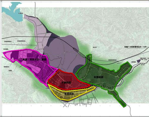 东南新区规划结构:一心三轴五社区。一心:彝海公园;三轴:彝海公园北侧东西向的公建轴(阳光大道)、青龙河景观轴、彝海公园北侧南北向生活轴;五社区:特色景观住宅区、滨水景观住宅区、山林景观住宅区、时尚街坊住宅区及社区特色住宅区。 |