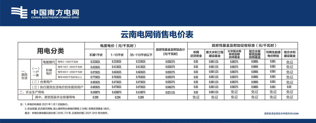 云南电网公司依据《云南省发展和改革委员会关于加快推进燃煤发电上网电价市场化改革的通知》(云发改价格〔2021〕913号),形成“云南电网公司销售电价表”,通过互联网服务渠道及营业场所对外公示。