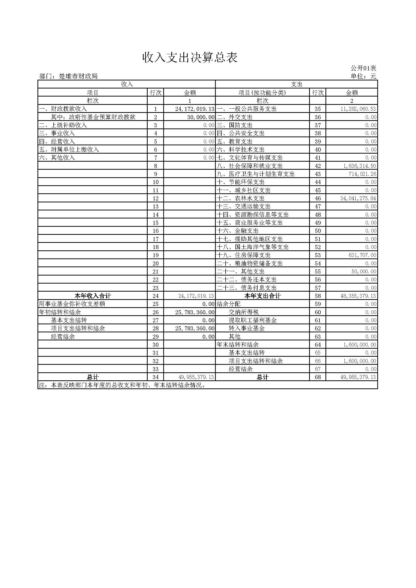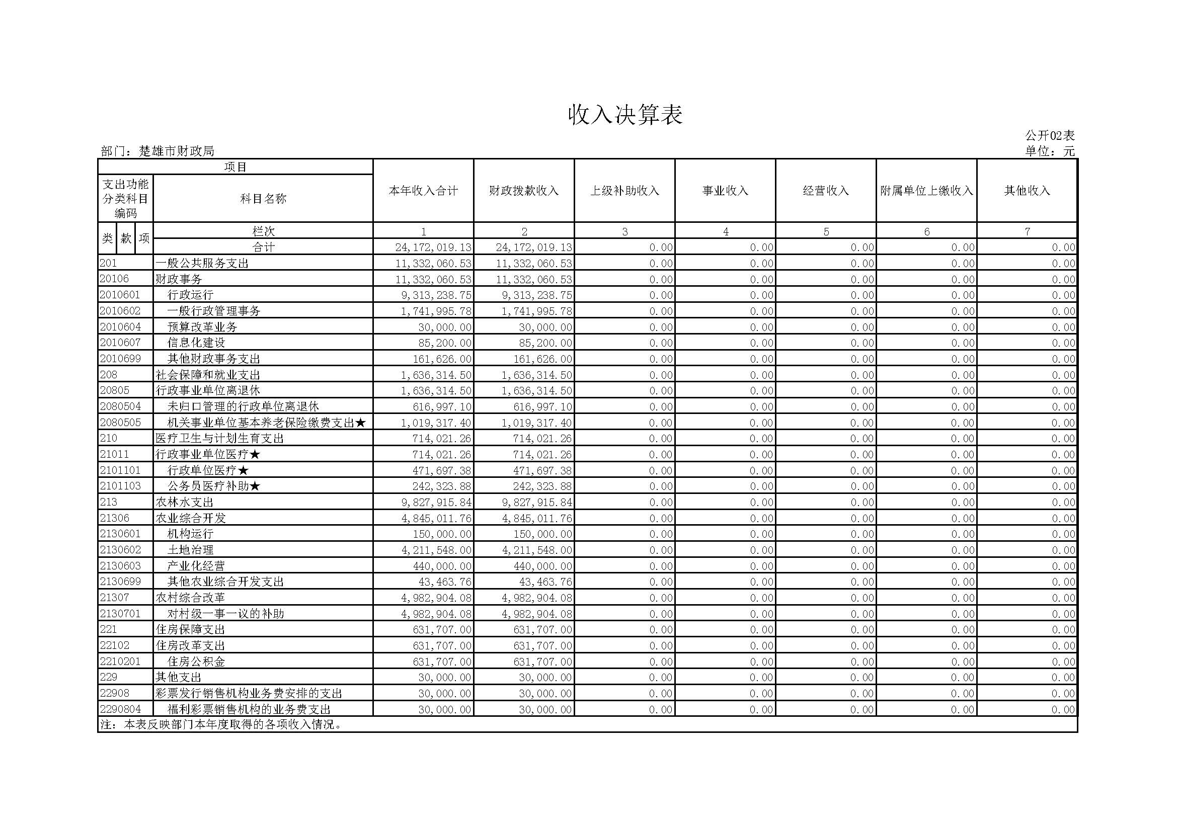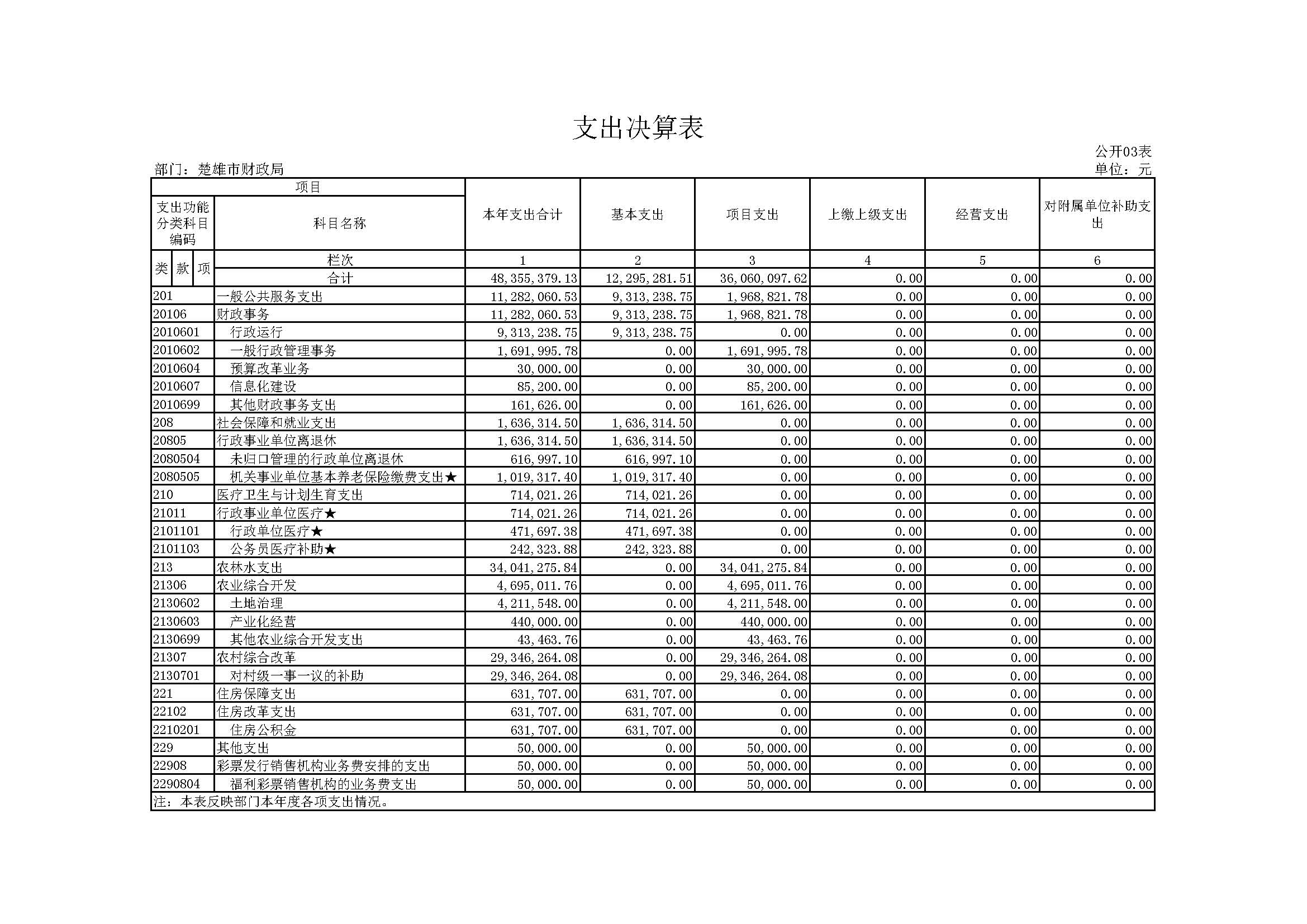 机构情况:楚雄市财政局总核算机构1个,另填报4个独立核算的楚雄市政府机构报表,内设19个科室。此部门决算公开表包括楚雄市财政局机关、楚雄市农业综合开发办公室、楚雄市农村综合改革办公室、云南省中华会计函授学校楚雄鹿城函授站的工作运行经费及项目工程款。