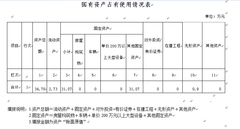 截至2020年12月31日,中国共产党楚雄市委员会政策研究室资产总额347017.95元,其中,流动资产27349.95元,固定资产310668元,对外投资及有价证券0万元,在建工程0元,无形资产9000元,其他资产0元(具体内容详见附表)。与上年相比,本年资产总额减少4.16万元,其中固定资产减少1.8万元。处置房屋建筑物0平方米,账面原值0万元;处置车辆0辆,账面原值0万元;报废报损资产6项,账面原值1.8万元,实现资产处置收入0万元;出租房屋0平方米,账面原值0万元,实现资产使用收入0万元。