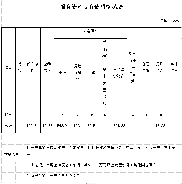 截至2021年12月31日,楚雄市财政局部门资产总额122.31万元,其中,流动资产18.86万元,固定资产548.94万元,对外投资及有价证券0万元,在建工程0万元,无形资产13.28万元,其他资产0万元(具体内容详见附表)。与上年161.53万元相比,本年资产总额减少39.22万元,其中固定资产减少9.27万元。处置房屋建筑物777平方米,账面原值15.12万元;处置车辆0辆,账面原值0万元;报废报损资产0项,账面原值0万元,实现资产处置收入0万元;出租房屋0平方米,账面原值0万元,实现资产使用收入0万元。