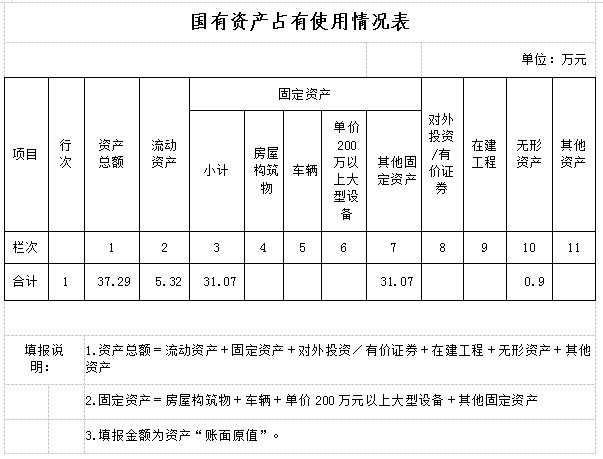 截至2021年12月31日,中国共产党楚雄市委员会政策研究室部门资产总额37.29万元,其中,流动资产5.32万元,固定资产31.07万元,对外投资及有价证券0万元,在建工程0万元,无形资产0.9万元,其他资产0万元(具体内容详见附表)。与上年相比,本年资产总额增加3.22万元,其中固定资产增加0万元。处置房屋建筑物0平方米,账面原值0万元;处置车辆0辆,账面原值0万元;报废报损资产0项,账面原值0万元,实现资产处置收入0万元;出租房屋0平方米,账面原值0万元,实现资产使用收入0万元。
