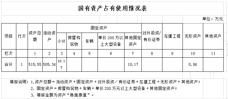 截至2021年12月31日,高新技术产业开发区规划建设管理部门资产总额515.55万元,其中,流动资产505.34万元,固定资产10.17万元,对外投资及有价证券0万元,在建工程0万元,无形资产0.04万元,其他资产0万元(具体内容详见附表)。与上年相比,本年资产总额增加0万元,其中固定资产增加0万元。处置房屋建筑物0平方米,账面原值0万元;处置车辆0辆,账面原值0万元;报废报损资产0项,账面原值0万元,实现资产处置收入0万元;出租房屋0平方米,账面原值0万元,实现资产使用收入0万元。