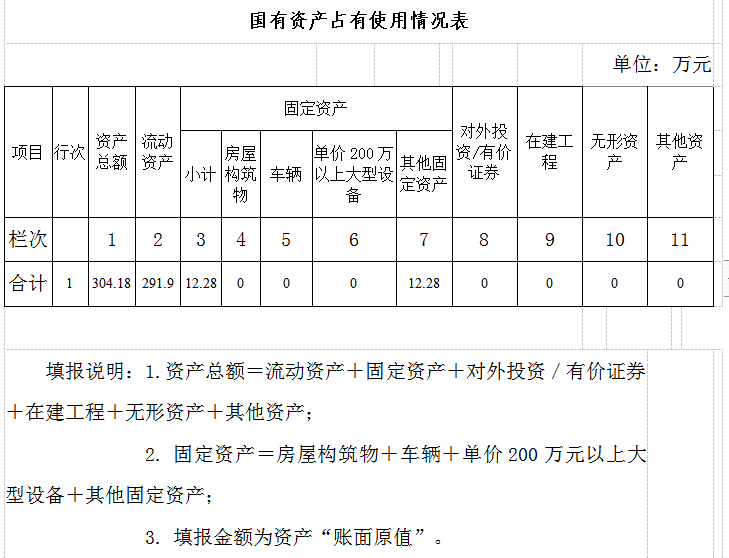 截至2021年12月31日,楚雄高新区经济发展部资产总额304.18万元,其中,流动资产291.9万元,固定资产12.28万元,对外投资及有价证券0万元,在建工程0万元,无形资产0万元,其他资产0万元(具体内容详见附表)。与上年相比,本年资产总额减少456.7万元,其中固定资产增加1.19万元。处置房屋建筑物0平方米,账面原值0万元;处置车辆0辆,账面原值0万元;报废报损资产0项,账面原值0万元,实现资产处置收入0万元;出租房屋0平方米,账面原值0万元,实现资产使用收入0万元。