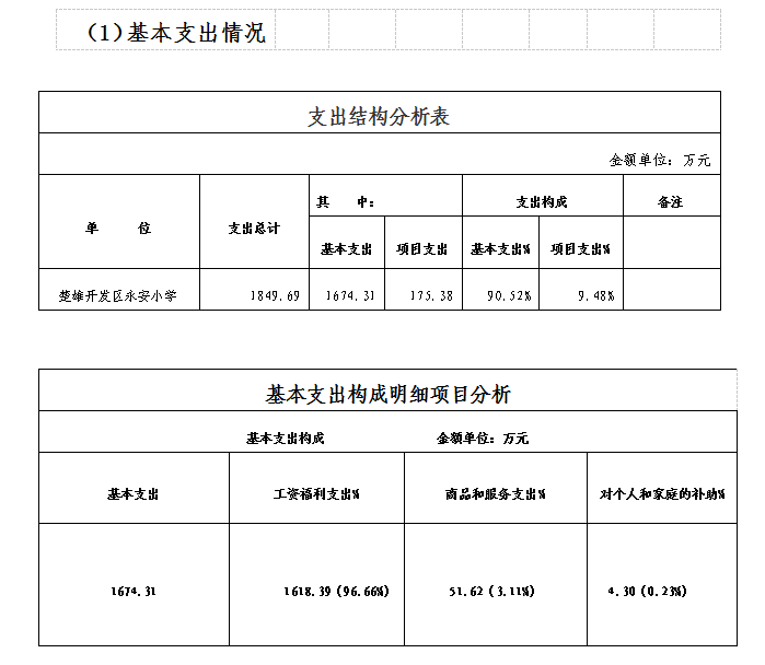 2021年度用于保障楚雄开发区永安小学正常运转的日常支出1,674.31万元。与上年(2020年)对比2021年基本支出增加了207.36万元,主要原因是教职工住房公积金、医疗保险、养老保险等基本支出增加所致。其中:基本工资、津贴补贴等人员经费支出1622.69万元,占基本支出的96.89%;办公费、印刷费、水电费、办公设备购置等公用经费51.62万元,占基本支出的3.11%。