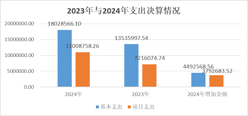 与上年相比,支出合计增加8285252.08元,增长39.92%。其中:基本支出增加4492568.56元,增长33.19%;项目支出增加3792683.52元,增长52.56%;无上缴上级支出增加;无经营支出增加;无对附属单位补助支出增加。主要原因是2024年有效履行单位核心职能,人员经费和公用经费随政策标准调整而合理增加,2024年度有新招录人员,人员支出、公用经费支出增加,导致基本支出增加;根据上级工作部署和本单位事业发展需要,新增了楚雄市大过口乡2024年彝花刺绣有限公司彝绣车间提升改造建设项目、楚雄市大过口乡2024年野猪塘村核桃一体化加工项目、楚雄市大过口乡2024年杞岔拉茶厂生产配套设施建设项目、楚雄市大过口乡2024年蚕豆田村委会农产品初加工厂建设项目等项目支出,导致项目支出增加。