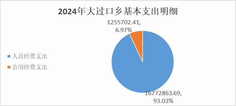 2024年度用于保障楚雄市大过口乡机构正常运转的日常支出18028566.10元。其中:基本工资、津贴补贴等人员经费支出16772863.69元,占基本支出的93.03%;办公费、印刷费、水电费、办公设备购置等公用经费1255702.41元,占基本支出的6.97%。