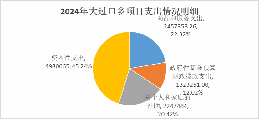 2024年度用于保障楚雄市大过口乡为完成特定的行政工作任务或事业发展目标,用于专项业务工作的经费支出11008758.26元。其中:基本建设类项目支出0.00元,占比0.00%;商品和服务支出2457358.26元,占比22.32 %,其中:办公费1046848.16元,电费41245.62元,印刷费7570.00元,差旅费21396.30元,维修(护)费122600.00元,会议费103232.18元,培训费240000.00元,公务接待费146424.00元,劳务费697275.00元,公务用车运行维护费38337.00元;对个人和家庭的补助2247484.00元,占比20.42 %,其中:生活补助853272.00元,个人农业生产补贴1394212.00元;资本性支出4980665.00元,占比45.24%,其中:基础设施建设4856365.00元,办公设备购置4300.00元,专用设备购置120000.00元;政府性基金预算财政拨款支出1323251.00元,占比12.02 %,其中:农村基础设施建设支出903251.00元,农业农村生态环境支出120000.00元,用于其他