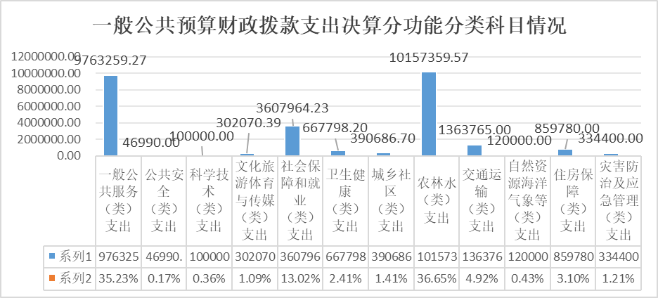 1.一般公共服务(类)支出9763259.27元,占一般公共预算财政拨款总支出的35.23%,完成年初预算的103.78%。主要用于我乡行政单位机构运作和相关事业发展支出;造成预决算差异的主要原因是本年度补发了2023年度综合绩效奖,发放2023年度9个行政村综合绩效奖,以及对以往年度拖欠款项进行支付,导致本年度支出增加。