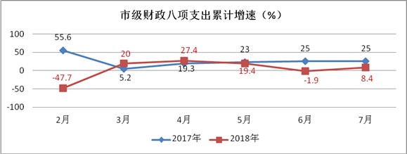 9.市级财政八项支出完成25.7亿元,增长8.4%,增速较去年同期(25%)回落16.6个百分点,较1至6月(-1.9%)提高10.3个百分点。