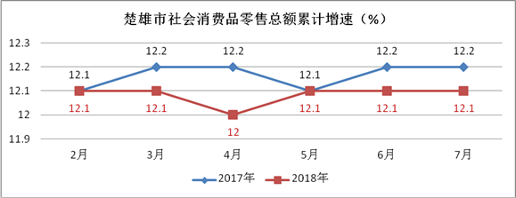 4.社会消费品零售总额完成88.72亿元,增长12.1%,增速较去年同期(12.2%)回落0.1个百分点,与1至6月(12.1%)持平。