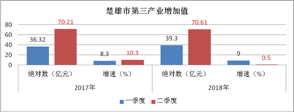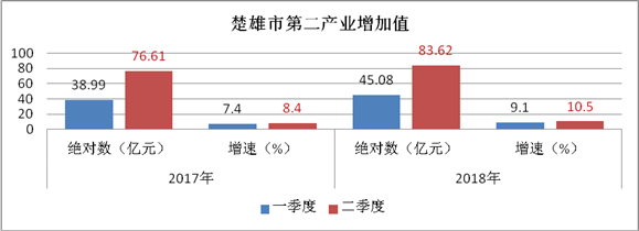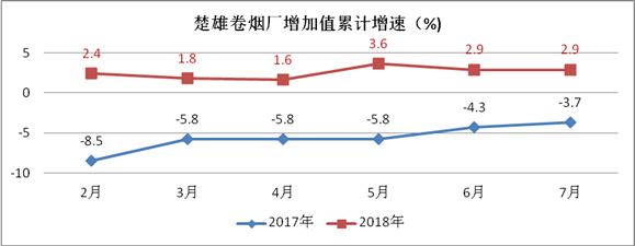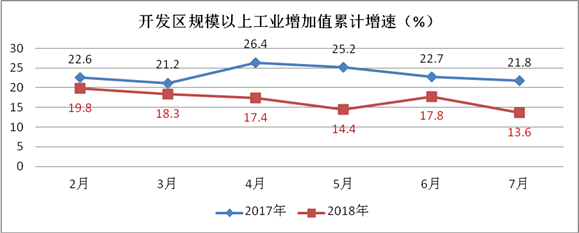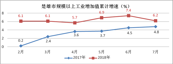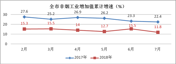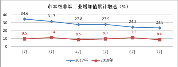 2.全市规模以上工业增加值增长6.2%,增速较去年同期(4.8%)提高1.4个百分点,较1至6月(7.4%)回落1.2个百分点,其中楚雄卷烟厂增加值增长2.9%,增速较去年同期(-3.7%)提高6.6个百分点,与1至6月(2.9%)持平;市本级非烟工业增加值增长8.6%,增速较去年同期(23.5%)回落14.9个百分点,较1至6月(11.2%)回落2.6个百分点;开发区规模以上工业增加值增长13.6%,增速较去年同期(21.8%)回落8.2个百分点,较1至6月(17.8%)回落4.2个百分点;全市非烟工业增加值增长11.8%,增速较去年同期(22.4%)回落10.6个百分点,较1至6月(15.5%)回落3.7个百分点。