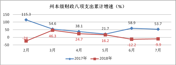 8.州本级财政八项支出完成12.43亿元,下降9.9%,增速较去年同期(53.7%)回落63.6个百分点,较1至6月(-12.2%)收窄2.3个百分点。