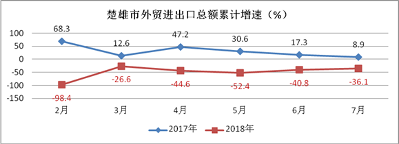5.外贸进出口总额完成11749万美元,下降36.1%,增速较去年同期(8.9%)回落45个百分点,较1至6月(-40.8%)收窄4.7个百分点。