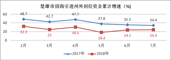 6.引进州外到位资金完成190.46亿元,增长24.4%,增速较去年同期(34.4%)回落10个百分点,较1至6月(24.1%)提高0.3个百分点。