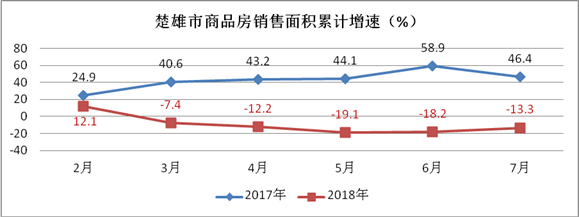 3.商品房销售面积完成60.01万平方米,下降13.3%,增速较去年同期(46.4%)回落59.7个百分点,较1至6月(-18.2%)收窄4.9个百分点。