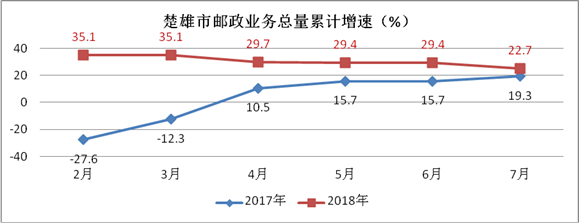 5.邮政业务总量增长22.7%,增速较去年同期(19.3%)提高3.4个百分点,较1至6月(29.4%)回落6.7个百分点。