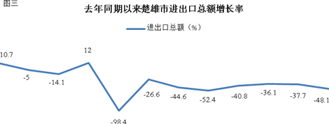 今年以来,受外部市场需求环境持续低迷影响,前三季度外贸出口持续下滑,据商务部门统计,1-9月楚雄市进出口总额1.37亿美元,同比下降48.1%,其中,出口额1.37亿美元,下降48.1%。