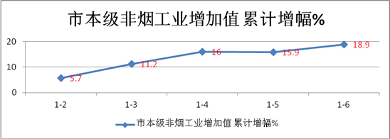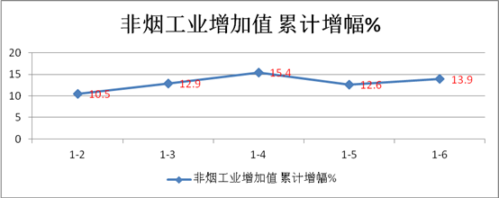 1.全市规模以上工业平稳增长。1-6月,全市规上非烟工业高速增长13.9%,烟草制品业小幅增长2.5%,但由于烟草制品业占我市规模以上工业比重较大(57%,2018年可比价比重),规模以上工业增加值仅增长7.8%。