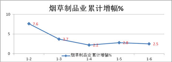 2.今年以来,烟草制品业在国际国内持续控烟形势影响下一直处于小幅增长,增加值6月当月同比增长1.2%,累计同比增长2.5%,与上月相比下降0.3个百分点,占我市规上工业增加值比重为51.1%(可比价)。