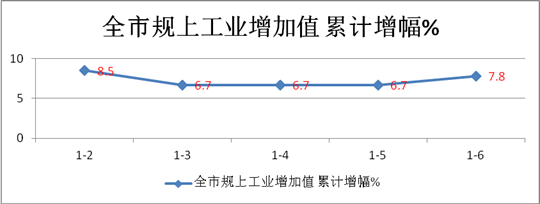 1-6月,累计实现增加值过亿元的9个行业“八升一降”,占全部规上工业增加值比重的95.5%,支撑作用明显,可以看出,我市工业经济结构单一,受少数行业波动影响较大。