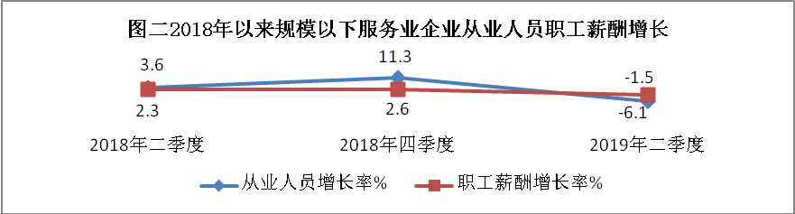 分行业看,从事房地产业活动企业平均应付职工薪酬23.3万元,同比增长15.9%,单位从业人员平均人数下降11.7%。从劳动者报酬成长来看,房地产行业活动的企业成长要好于从事其他行业活动的企业,按1-5月月平均薪酬推算,房地产业企业从业人员人均月平均薪酬达到4728元,同比增长31%。成长最差的行业是交通运输和邮政仓储业,该行业企业资产总规模比上年同期下降1.5%,从业人员薪酬下降31%。总体上看,自2018年二季度以来,规模以下服务业小微企业从业人员平均人数和职工平均薪酬双双下滑(图二)。