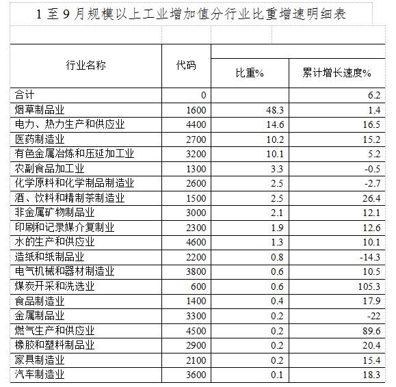 从轻重工业看:1至9月,轻工业增加值同比增长4.2%,重工业同比增长10.6%。