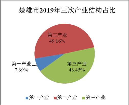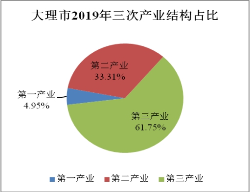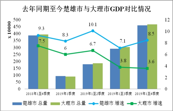 2019年,楚雄市实现生产总值460.63亿元,按可比价计算(下同),增长8.5%,增速居全省129个县(市、区)第79位,居全省8个有烟城市第3位;大理市实现生产总值467.94亿元,增长3.6%,增速居全省129个县(市、区)第124位,居全省8个有烟城市第8位。楚雄市第一、第二、第三产业分别增长5.6%、9.4%、7.8%,三次产业结构比重为7.4:49.2:43.4;大理市第一、第二、第三产业分别增长4.8%、-2.9%、8.1%,三次产业结构比重为4.9:33.3:61.8。